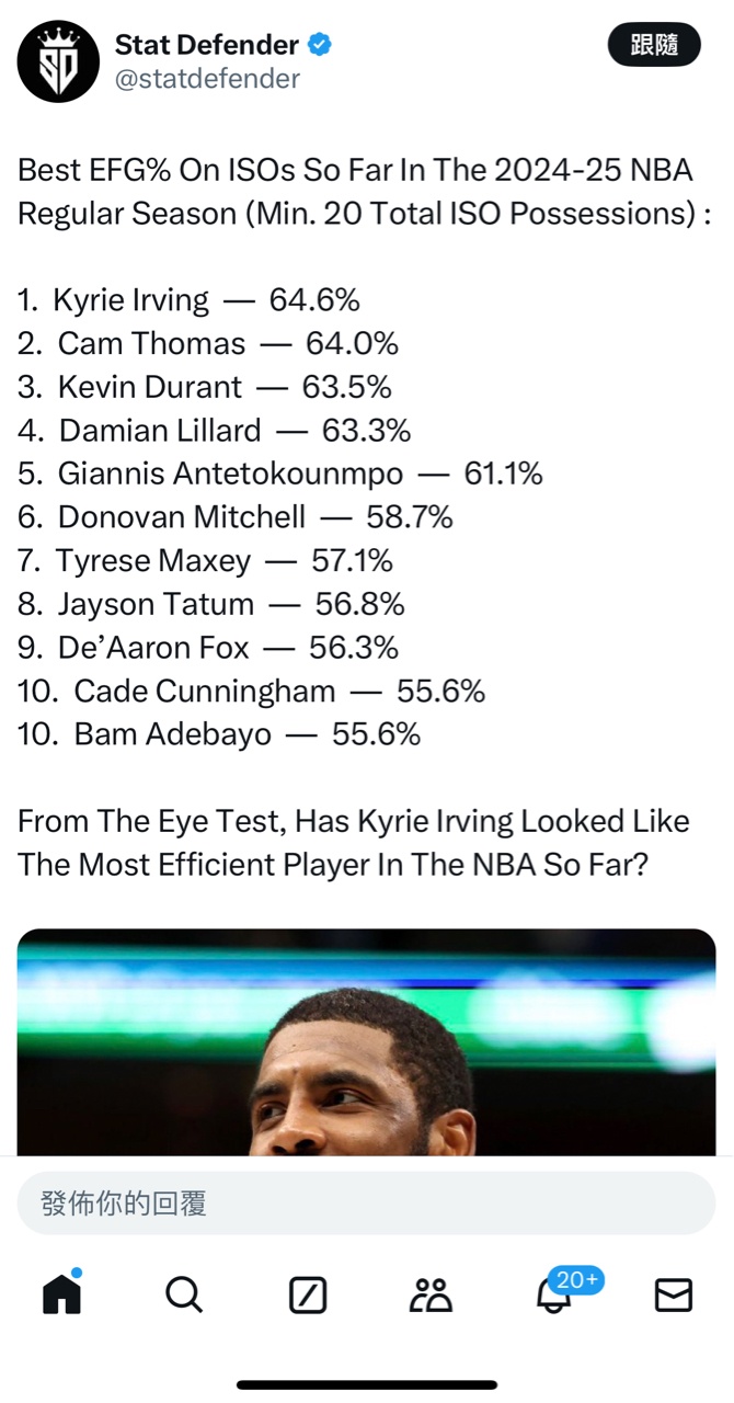 → kingroy : 不對 哈登單打佔比 高達33.9% 聯盟第一名 11/27 09:49