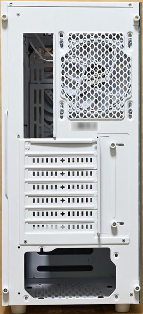 ▼機殼後方右上長條形固定孔可安裝1個120mm風扇,水冷排可裝到120mm,提供7個標準擴