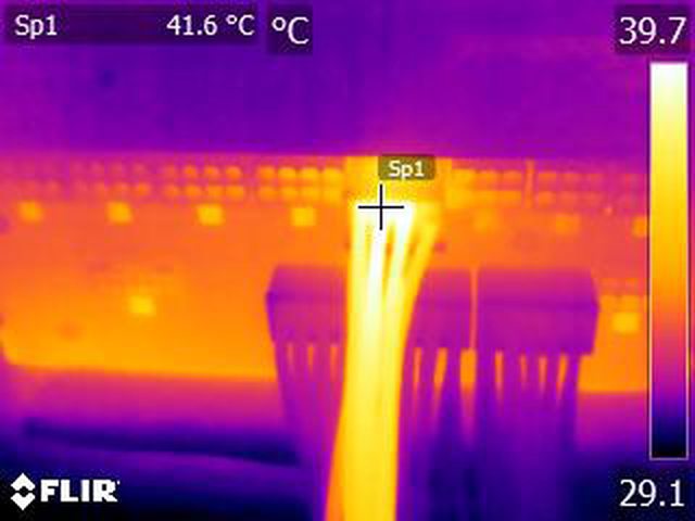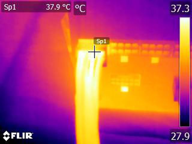 ▼執行FURMARK 30分鐘後電源端插頭的紅外線熱影像圖(附註:安裝位置環境溫度會影響