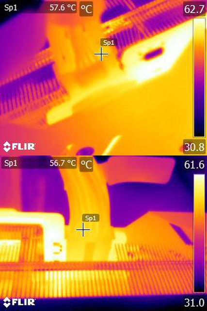 ▼電源供應器滿載輸出下內部(上圖)及背面外殼(下圖)的紅外線熱影像圖(附註:安裝位