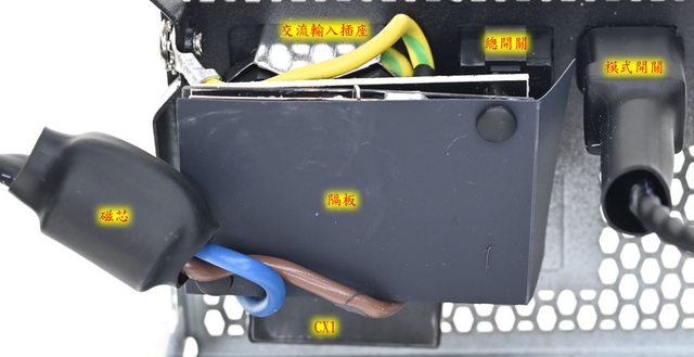 ○交流輸入插座及總開關後方小電路板背面覆蓋隔板。磁芯/交流電源線/模式開關本體/