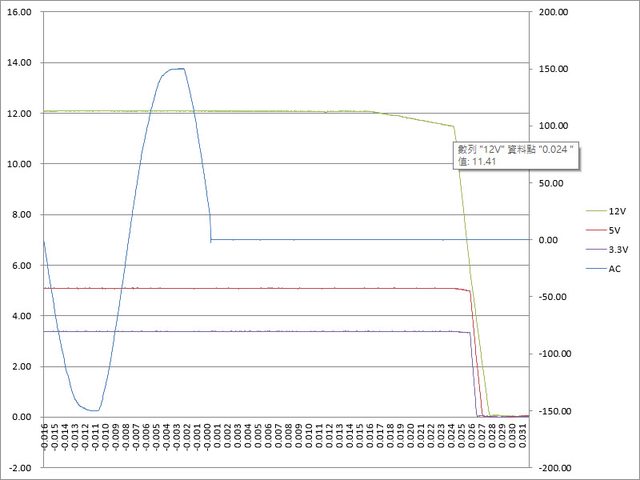 ○110V輸入下綜合全負載輸出狀態切斷AC輸入模擬電力中斷,12V於24ms降至11.41V