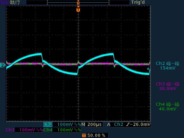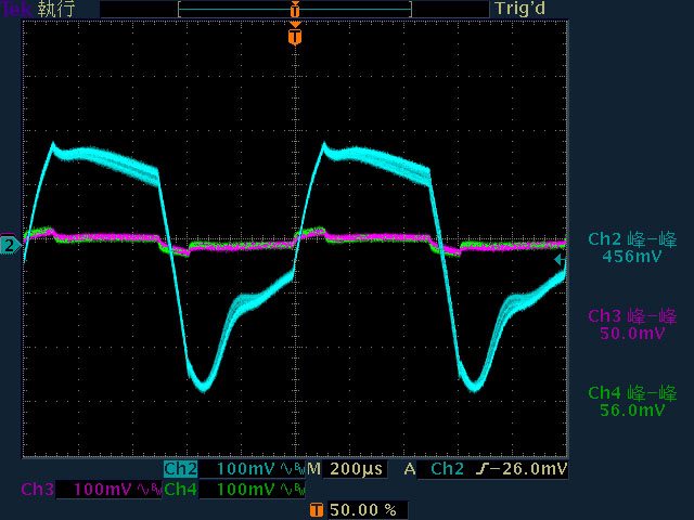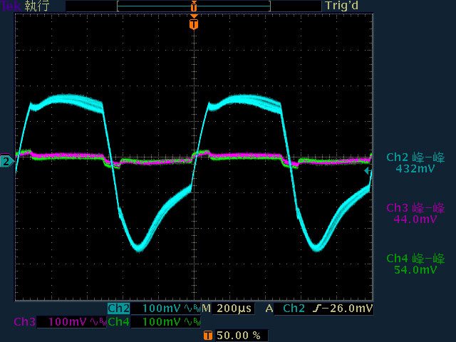 ○110V輸入下輸出無負載時12V無明顯漣波;輸出12V/4A以上12V漣波波形固定,只改變振