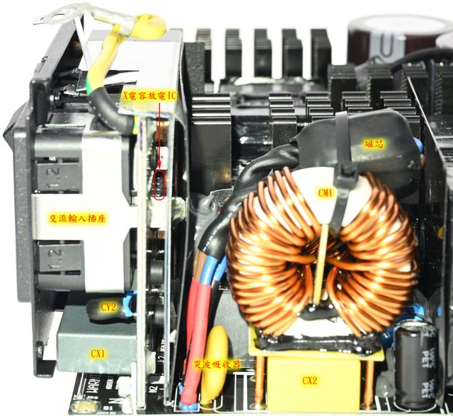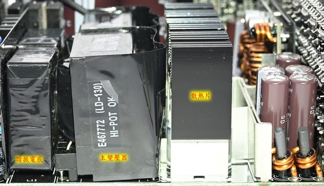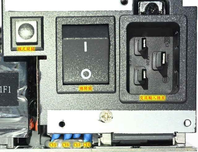 ○IEC 60320 C20交流輸入插座、總開關及模式開關後方小電路板覆蓋金屬罩及隔板。磁