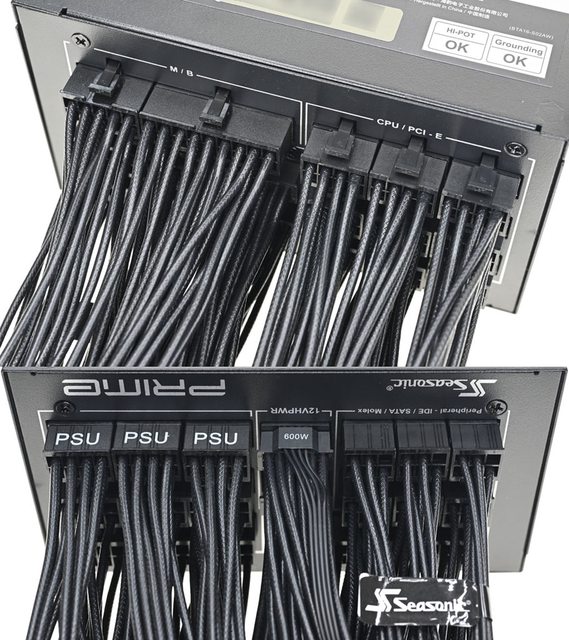 ▼模組化線組輸出插座有名稱標示,左下方有Seasonic商標,右下方有PRIME字樣