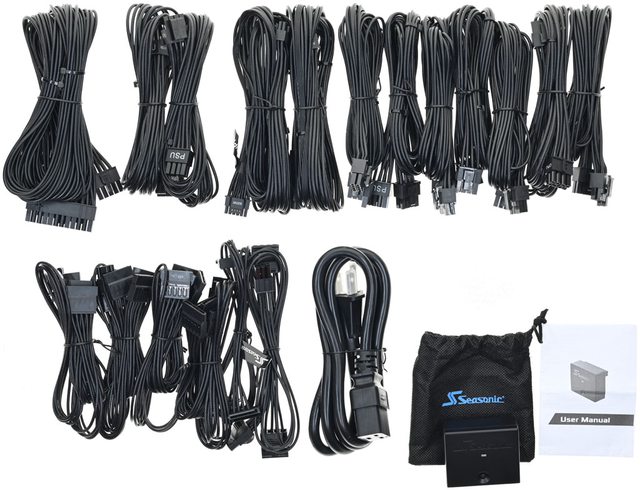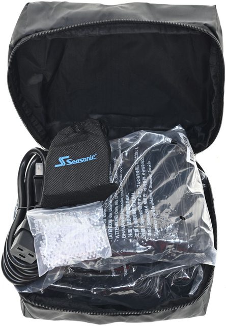 ▼包裝內容,模組化線組/交流電源線/配件裝在印有商標的黑色拉鍊包內,電源本體裝在