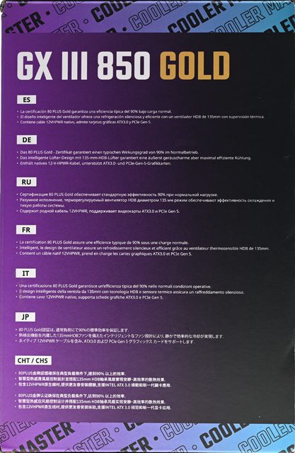 ▼外盒右側面有GX III 850 GOLD名稱及多國語言特色說明
