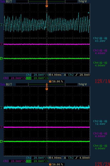 ▼輸出12V/1A時12V鋸齒狀漣波頻率及振幅加大(上圖),輸出12V/2A時有最小12V漣波(下