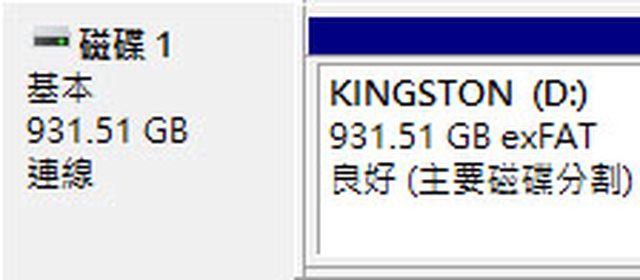 ▼磁碟標籤KINGSTON,預設exFAT格式,在Windows磁碟管理內實際可用容量為931.51GB(
