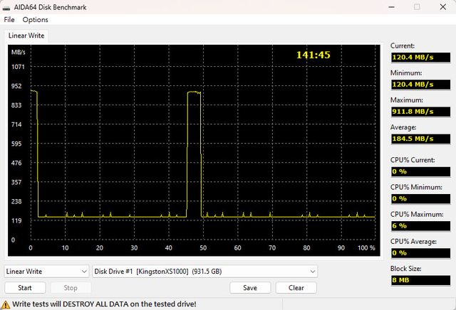 ▼AIDA64 Disk Benchmark連續寫入測試,最高速度911.8MB/s,最低速度120.4MB/s,測
