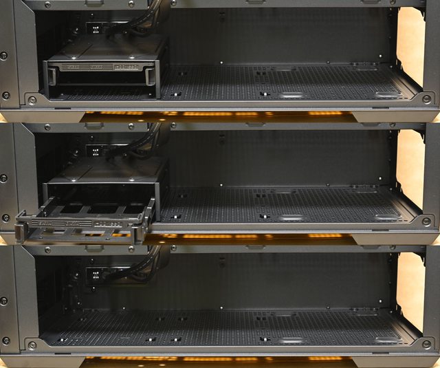 ○底部可拆卸式固定架具備1個抽取式托盤,可安裝2個3.5吋硬碟/2.5吋SSD。底板可拆卸