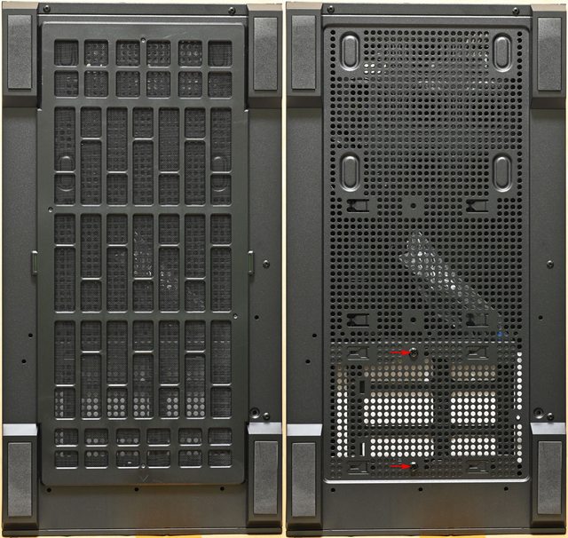 ▼右側前方風扇安裝位置為網狀設計,中間有長方形開口,長條形固定孔可安裝2個120mm