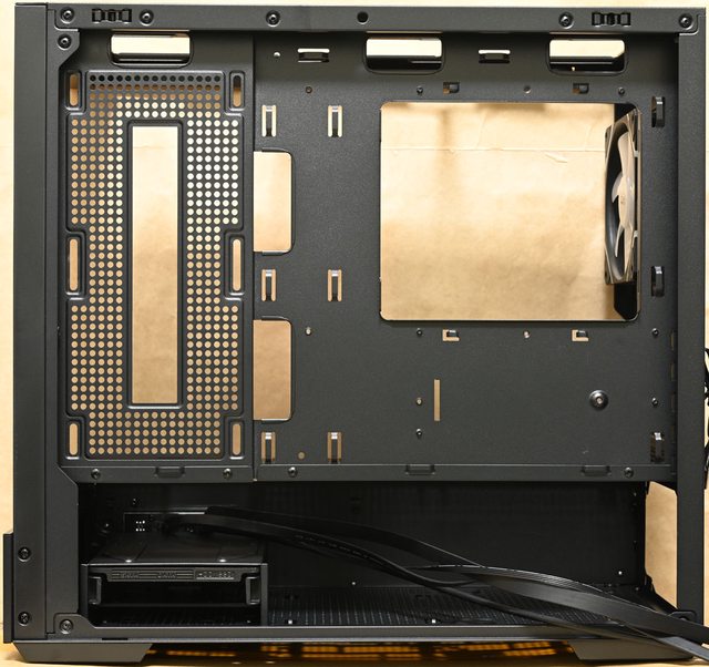 ▼機殼左側配置,主機板/介面卡安裝區與電源艙採隔離設計,底板最上方有3個長方形穿