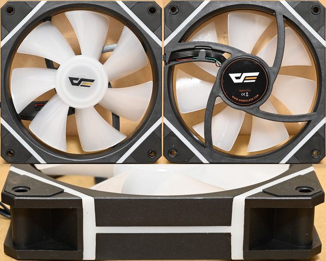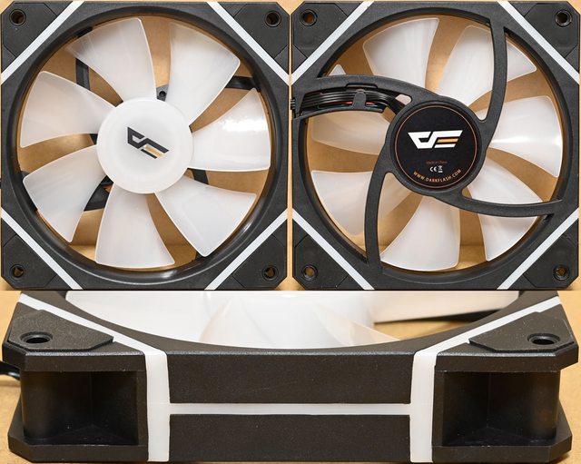 ▼反向ARGB發光120mm風扇,乳白色發光扇葉軸心處有商標,黑色外框中央貼紙有商標、