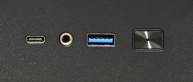 ▼位於機殼左側右下方的橫置式I/O埠、按鈕與指示燈,由左至右分別是1個USB3.2