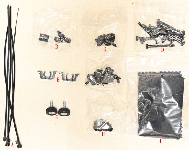 固定長螺絲(D)、備用球狀卡榫卡扣(E)、主機板銅柱/2.5吋螺絲(F)、手轉螺絲(G)、3.5