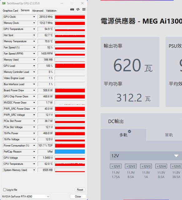 ▼超頻模式運作FurMark三十分鐘後的GPU-Z感測器資訊及電源供應器直流輸出功率