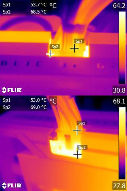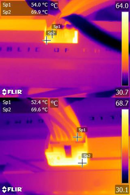 ▼預設模式運作FurMark三十分鐘後的12VHPWR接頭正面(上)及背面(下)的紅外線熱影像圖