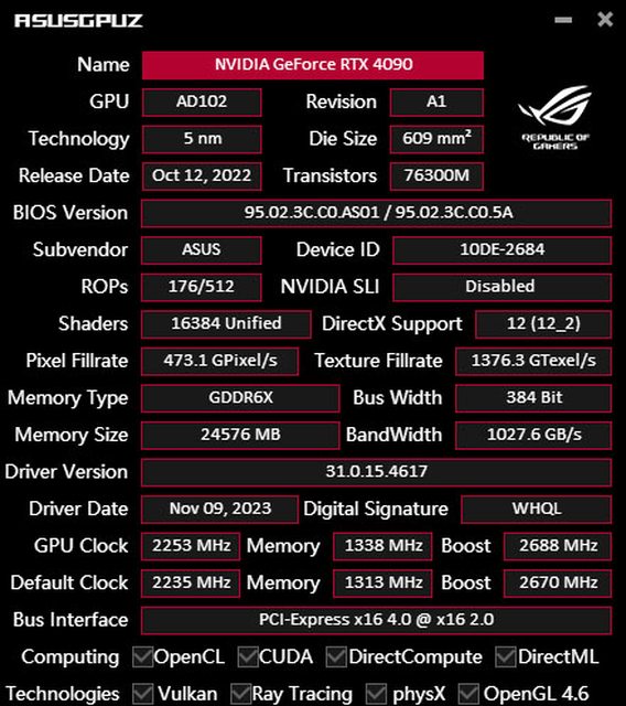 ▼ROG Matrix Platinum GeForce RTX 4090 24GB GDDR6X規格表: