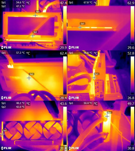 、後方(右)、水冷排(左下)、水冷排進/出水處(右下)的紅外線熱影像圖