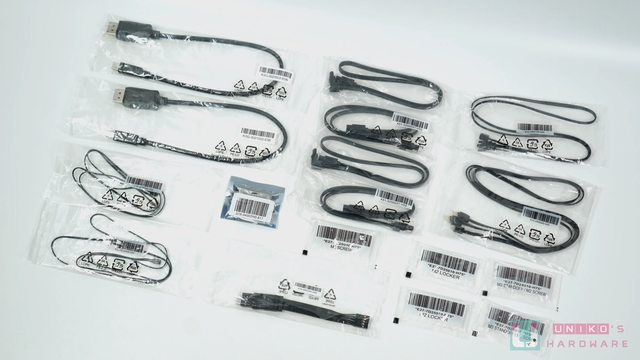 、1 支 USB 隨身碟、4 根 SATA 線材、多顆 EZ M.2 螺絲、1 根一體式的機殼前置 I/O 接