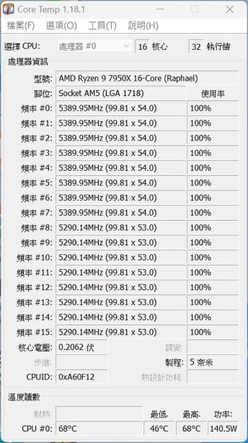 AVX重度負載約207W左右,時脈4.6-4.7G左右溫度約92度