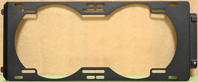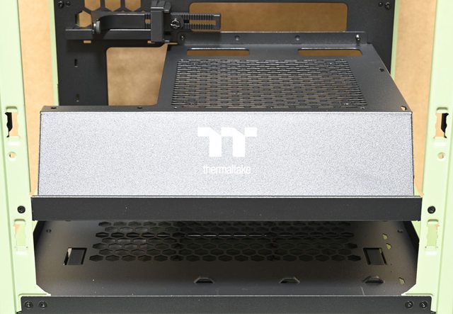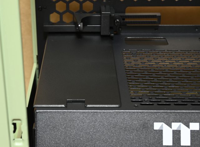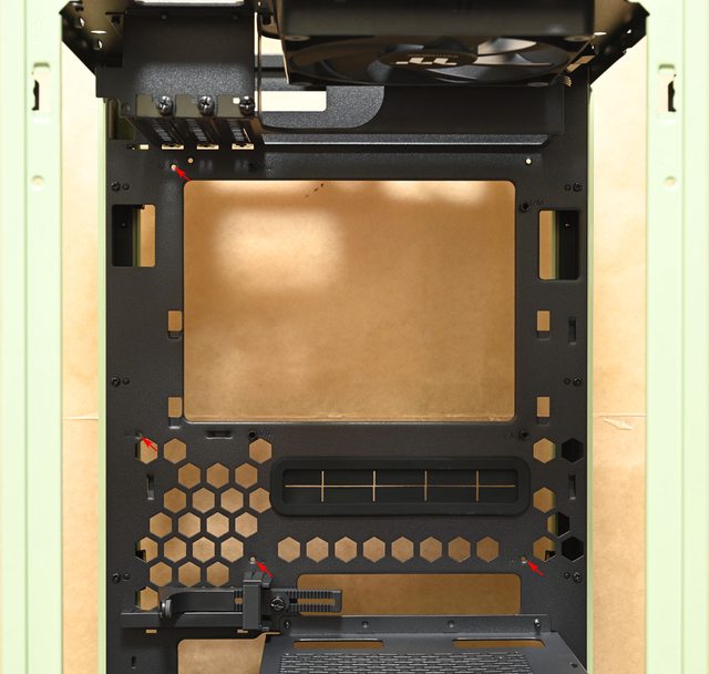 ,可對應Micro ATX主機板。底板上有3個長方形穿線開口及數個六角形通風孔洞