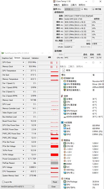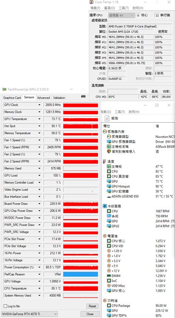 ▼CPU+GPU高負載30分鐘後Core Temp、GPU-Z感測器、AIDA64感測器頁面