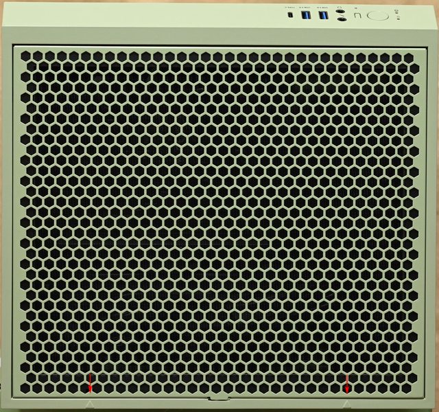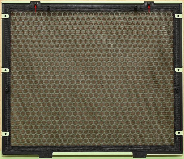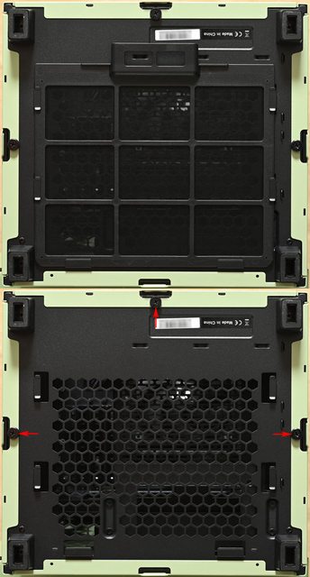 ▼機殼頂部通風網孔板採按壓式押扣固定,按壓三角形標誌位置(紅色箭頭)可以解鎖/鎖