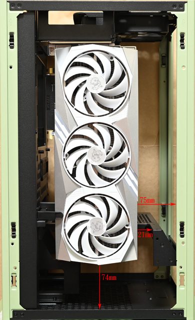 ,顯示卡前端與機殼底部距離74mm,顯示卡頂端與機殼正面強化玻璃視窗距離75mm