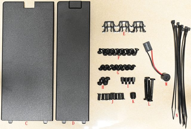 (J)、銅柱套筒工具(K)、電源艙頂部風扇固定長螺絲(L)、蜂鳴器(M)、塑膠束帶(N)
