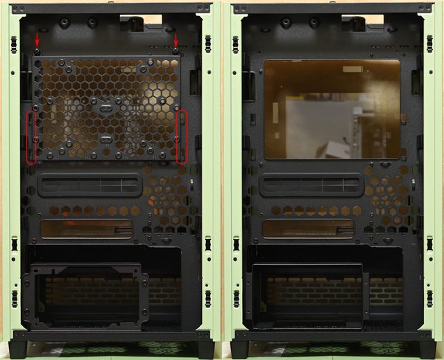 ▼後方蓋板背面兩側共有4個卡榫,通風口旁的固定孔可安裝2個120/140mm風扇,預裝1個