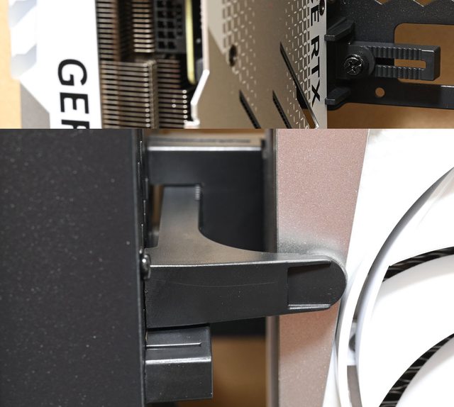 時,顯示卡右側無法接觸顯示卡輔助固定架右側托架(紅框),無法發揮固定效果。顯示卡