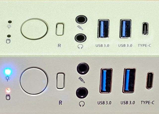 示燈、圓形電源按鈕、橢圓形重置按鈕、麥克風/耳機3.5mm插座、2個USB3.2 Type-A、1