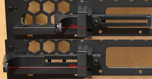 ▼底板上的顯示卡輔助固定架,鬆開手轉螺絲即可調整夾具寬度,調整範圍26公分至80公