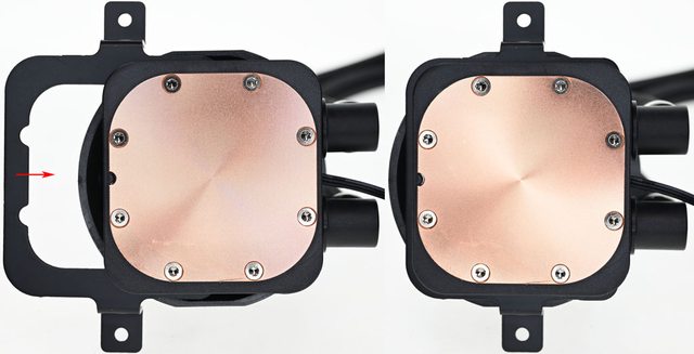 ▼水冷頭安裝AMD托架時,將托架開口從進/出水管對面方向插入水冷頭底部兩側溝槽(左