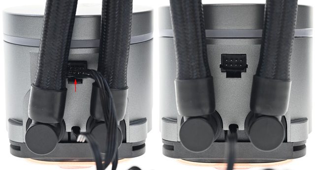 ▼水冷頭進/出水管直角接頭可小幅度左右旋轉,接頭之間區域下方接出幫浦3pin電源線