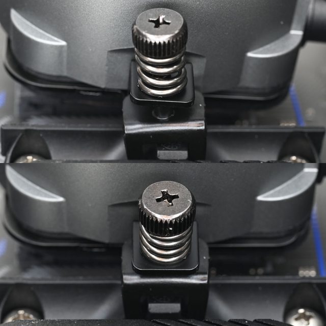 兩端扣耳扣入主機板原裝散熱器托架卡榫(上圖),兩端扣耳扣入後,採輪流方式(轉幾圈