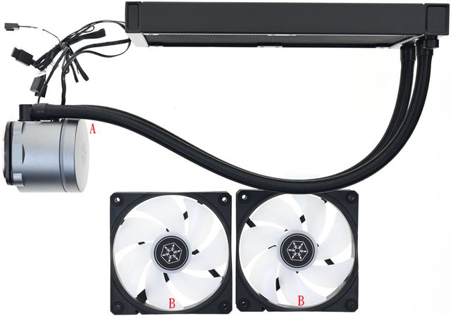 ▼包裝內有一體式水冷散熱器(A)、2個水冷排發光風扇(B)