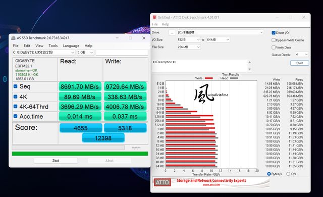 ATTO Disk Benchmark: Read最高約11.53 GB/s,Write最高約10.91 GB/s