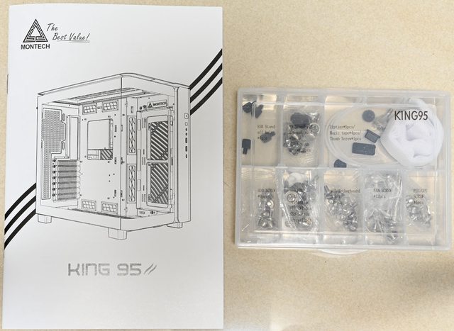▼配件盒正面有商標、顏色標示、KING 95字樣、正面網孔板安裝圖、左艙底部3.5吋/2.5