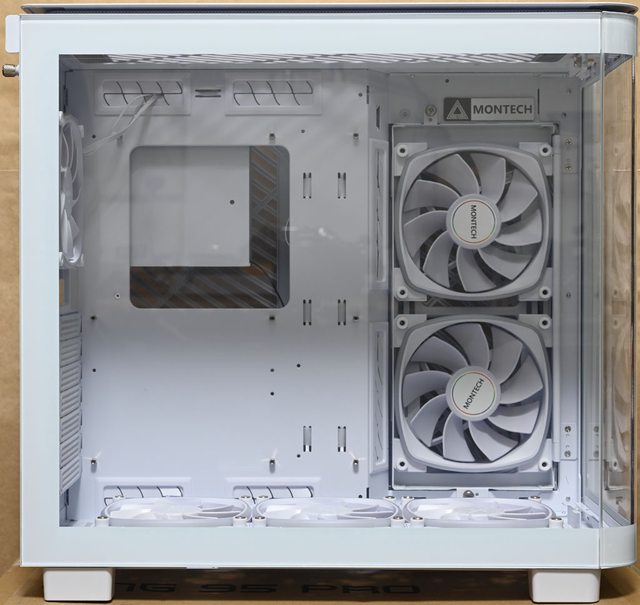 ▼左艙頂部固定架配置長條形固定孔,可安裝3個120mm或2個140mm風扇,水冷排可裝到