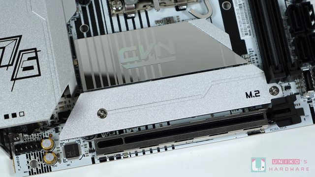 右下方是銀色磨砂材質的 M.2 散熱片,七彩虹這種作法有別於台系板廠慣用的垂直堆疊設