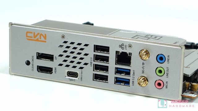 色,包含 CVN 散熱裝甲 (CPU 供電)、PCI-E 5.0 金屬插槽、Wi-Fi 6、以及雙 M.2 插槽設