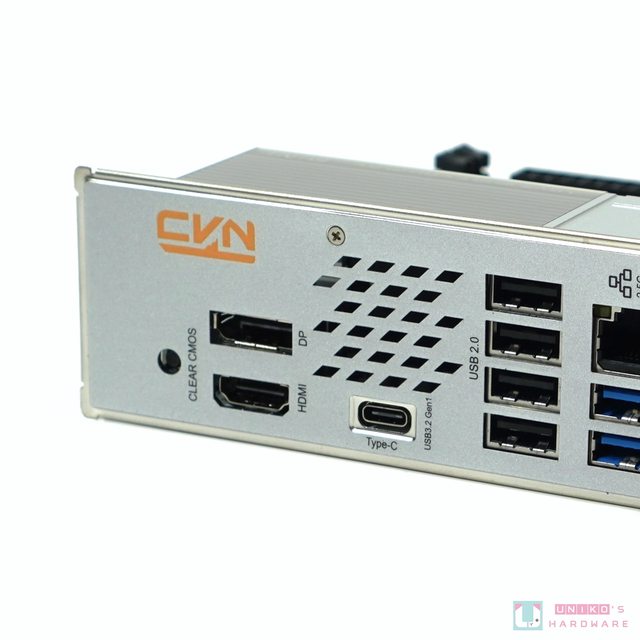 CPU 插槽下方的金屬散熱片是晶片組的部份,除了以結構色替"CVN"系列字樣做出識別,