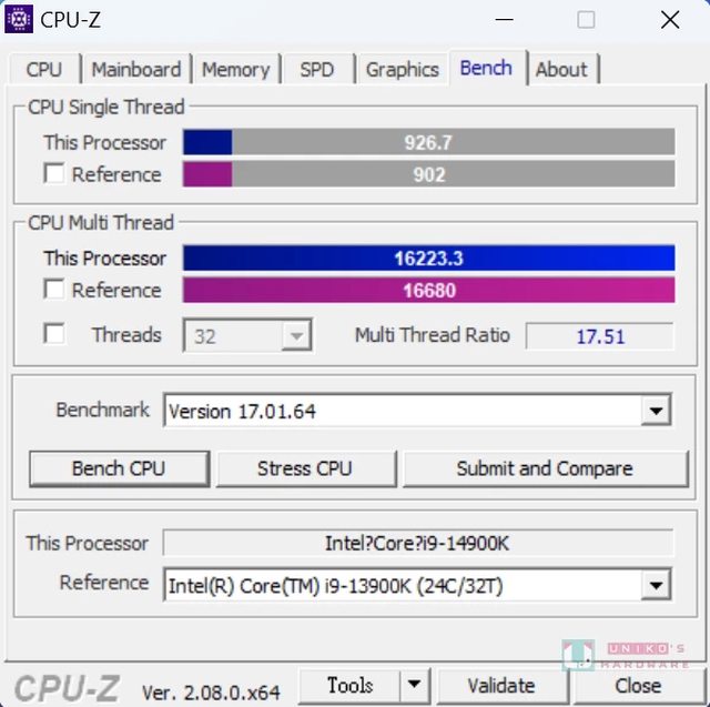 CPU-Z 單核心分數為 926.7、多核心分數為 16223.3。