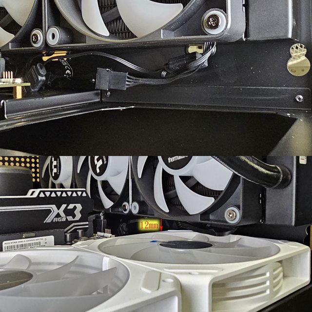 ▼風扇配置二:右側前方3個JONSBO ZG-120魔組扇進氣,上方Thermaltake TH360 V2