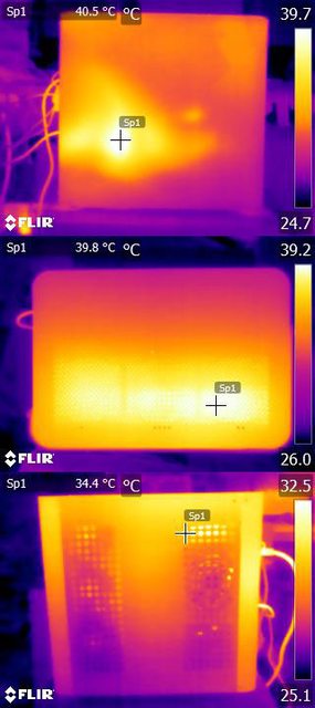 ▼風扇配置二:CPU+GPU高負載30分鐘後的左側(上)、頂部(中)及右側(下)紅外線熱影像