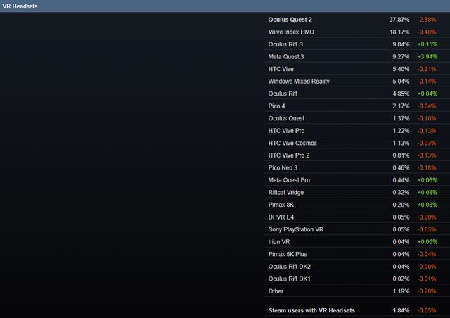 從Steam的硬體調查就能得知與Meta、HTC和Valve相比Windows Mixed Reality市占率真的