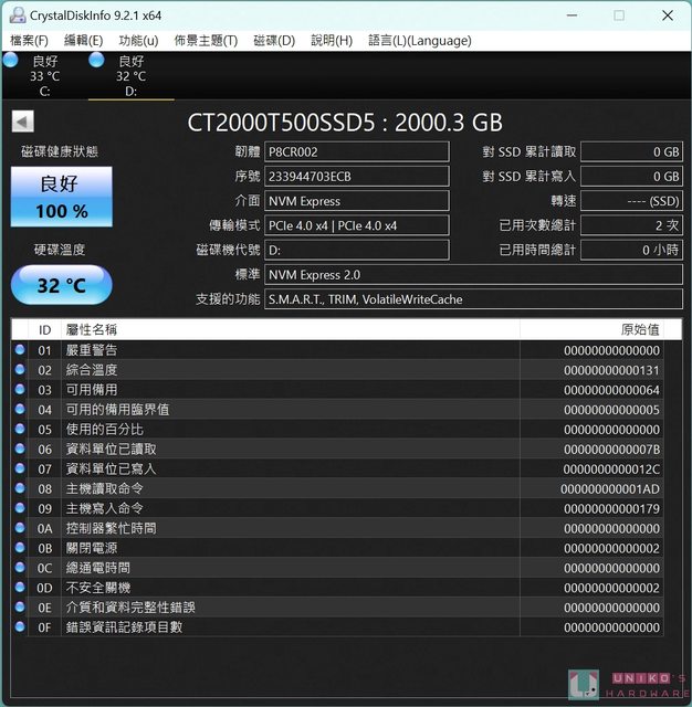 CrystalDiskInfo 中可以看到 Crucial T500 的規格資訊,採用 NVM Express 2.0 介面標